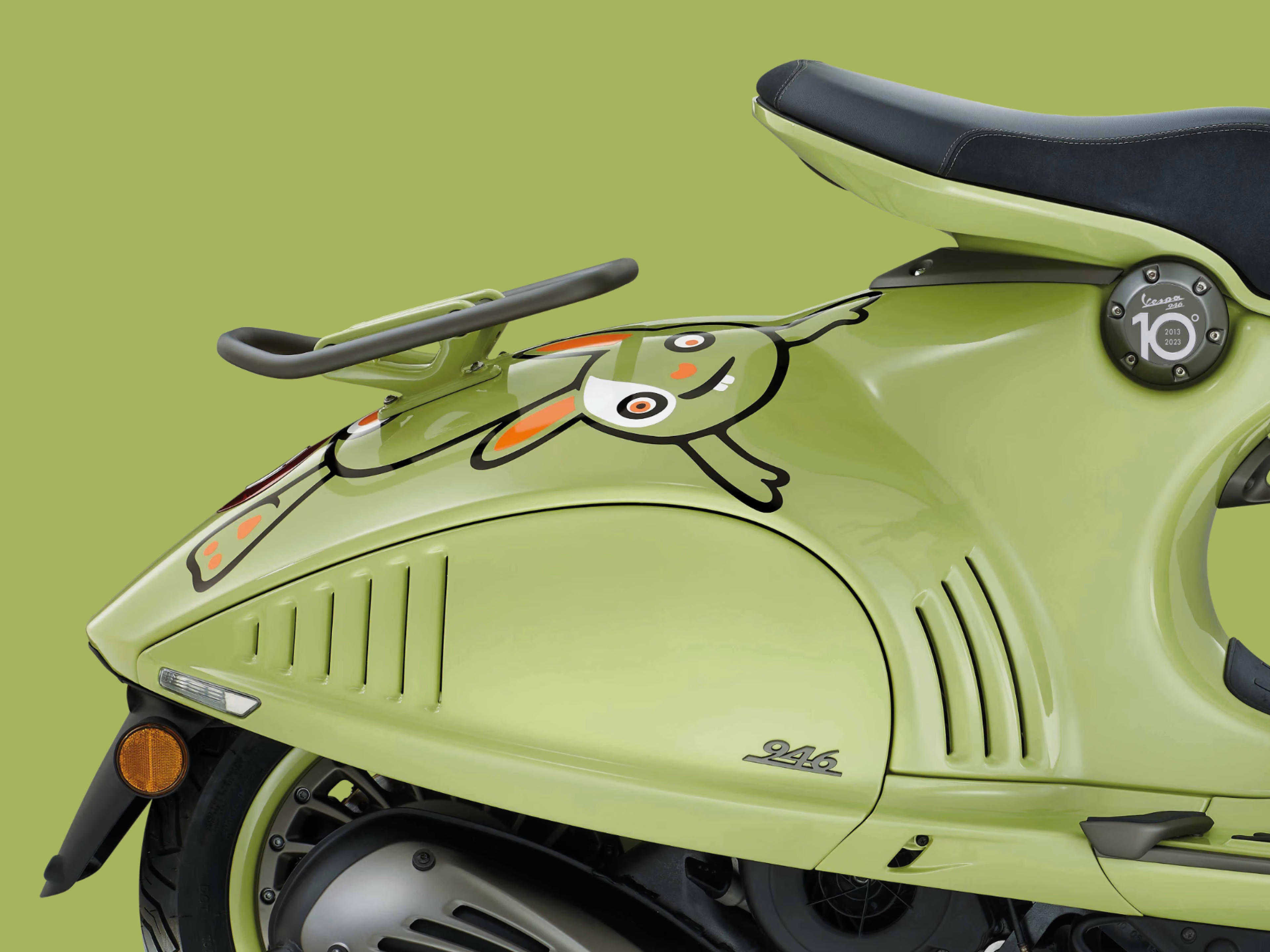 ผลงานระดับมาสเตอร์พีชจากอิตาลี กลับมาอีกครั้งเพื่อฉลองครบหนึ่งทศวรรษ ในรุ่นพิเศษ Vespa 946 10° Anniversario ดีไซน์เรียบหรูที่มาพร้อมความสดใสของสีเขียว และคาแรกเตอร์ประจำปีกระต่ายบริเวณเฟรมหน้าและตัวถัง และนี่คือจุดเริ่มต้นของคอลเลคชันพิเศษ กับการ collaboration เข้ากับสัตว์ประจำปี ทั้งหมด 12 รุ่น ตลอด 12 ปีนับจากนี้